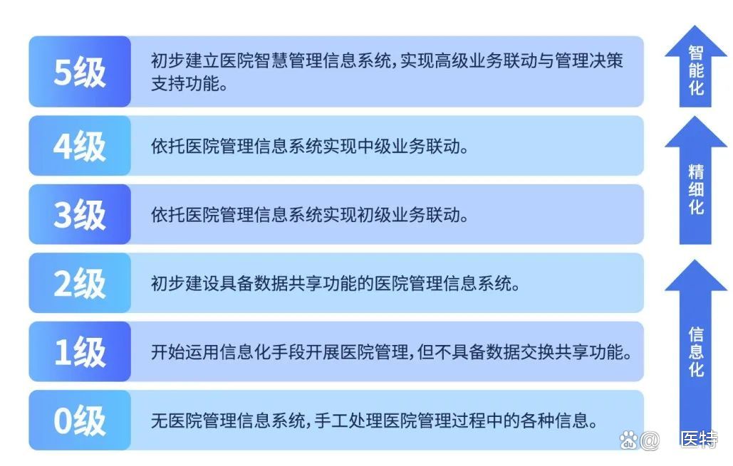 2019年,国家卫生健康委发布《医院智慧服务分级评估标准体系(试行)》,将医院“智慧服务”分成5级,主要指医院(特别是三级医院)利用互联网、物联网等信息化手段,为患者提供预约诊疗、候诊提醒、院内导航等服务,范围涵盖诊前、诊中、诊后和基础安全等就诊全流程。