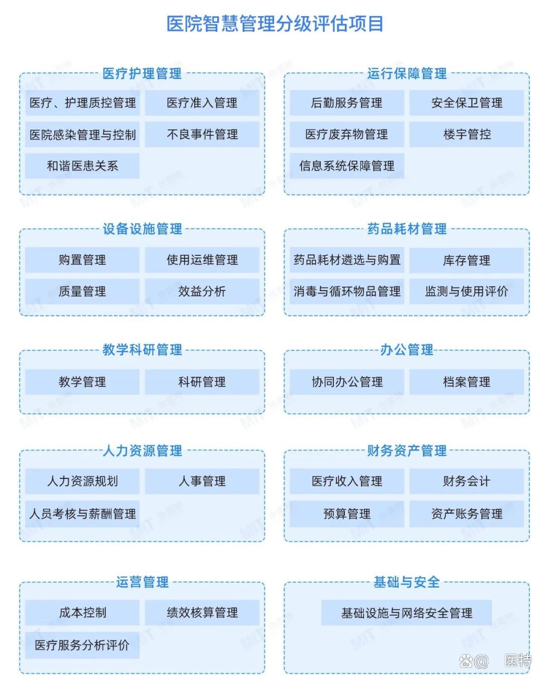 为落实现代医院管理制度,推动公立医院的高质量发展,《医院智慧管理分级评估标准》涉及范围包括医疗护理管理、人力资源管理、财务资产管理、设备设施管理、药品耗材管理、运营管理、运行保障管理、教学科研管理、办公管理及基础与安全共计10大类33项具体内容。